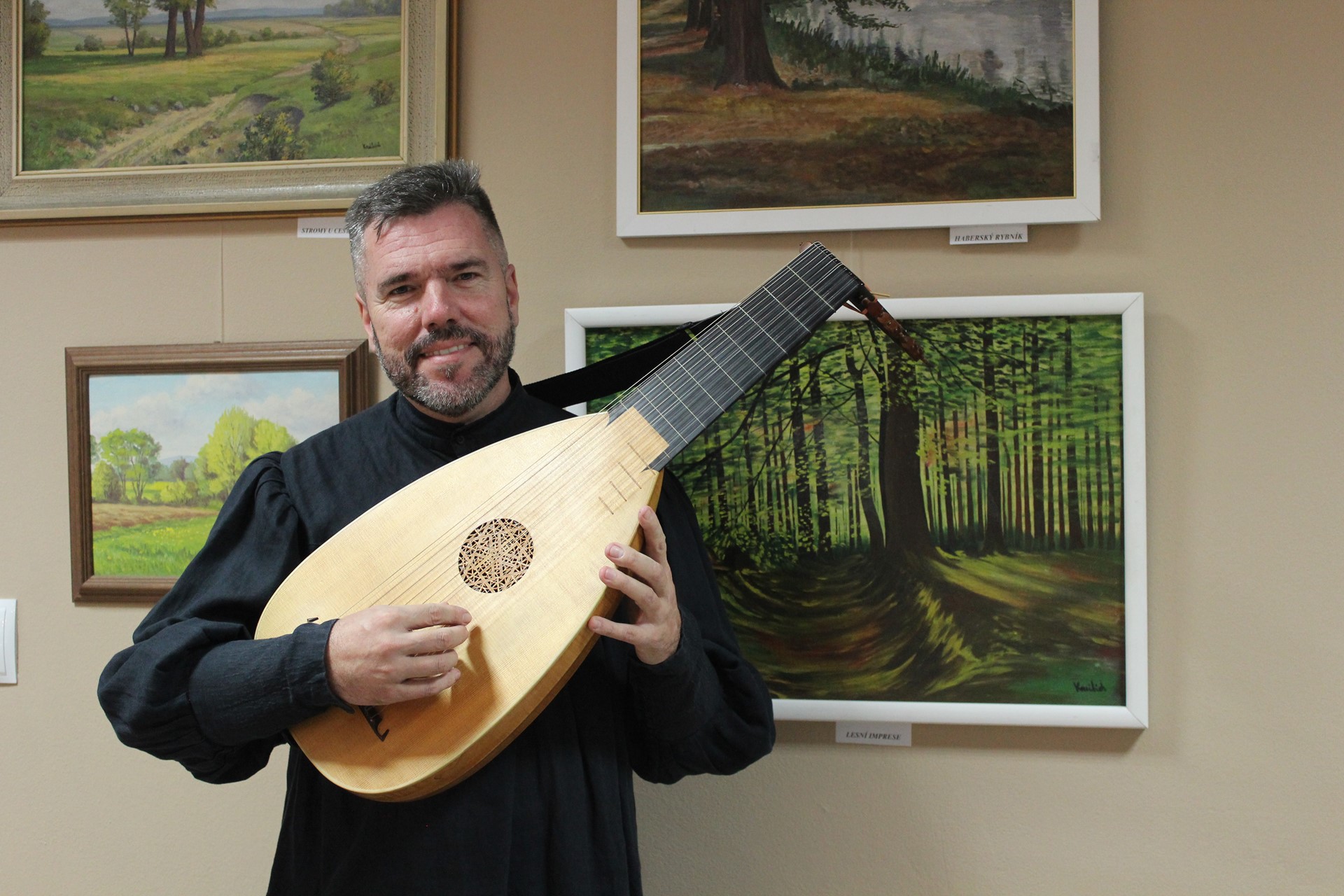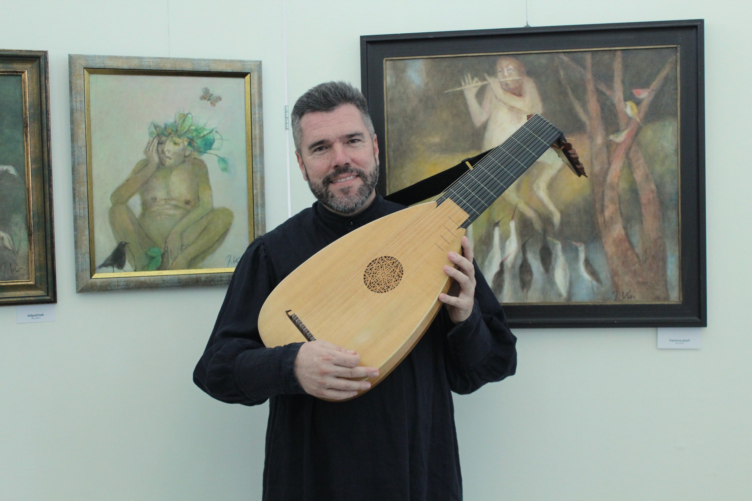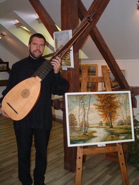 Přibyslav, Janáček galerie, sólová loutna na vernisáži výstavy akademického malíře Josefa Sasky (malby a grafiky), 11. 1. 2018