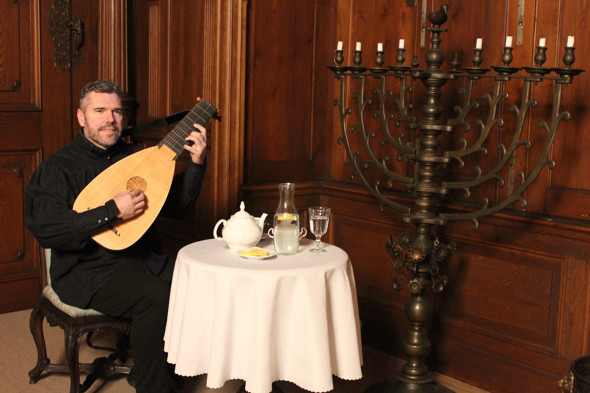 Praha, Velký sál Novoměstské radnice, sólová loutna při slavnostní příležitosti, 28.11.2019